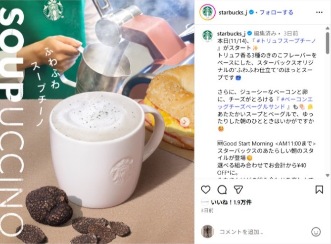 スターバックス日本が、初のスープ商品「トリュフスープチーノ」を発売。同時にモーニングセットを「Good Start Morning 」として刷新し、ドリンク+フードで40円引きにする施策も12月25日まで実施。単なる新商品の投入に見えて、実は3つの戦略的意図があると私は考えている。