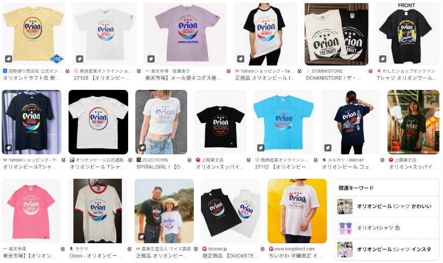 Googleで検索すると実に多くのパターンが生まれているわけでなく、センスが良いものも多い。ちいかわとのコラボTシャツもあり。サジェストで「オリオンビール Tシャツ かわいい」と出てくるのがスゴい!