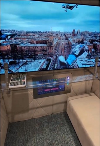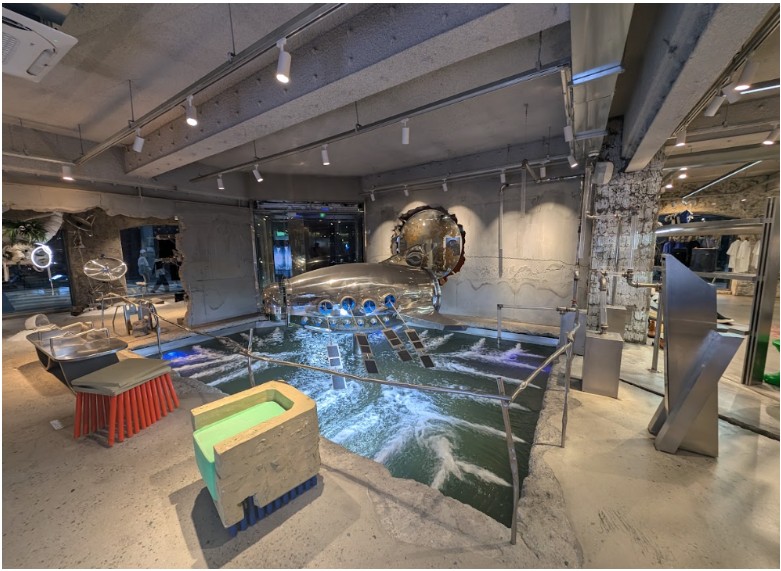 下記の写真はなんと試着室。試着室の中に大きなモニターがあり、そこでしか見られないオリジナルな映像が流れているという超絶こだわりの空間設計。どこも一切手を抜いていないデザイン性は韓国先端ブランドならでは。