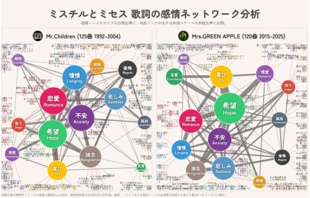 Mr.Children(1990年代)と http://Mrs.GREEN APPLE(現在)。100曲以上のこの2組の曲の歌詞を、感情ネットワークで可視化した分析が面白い。
