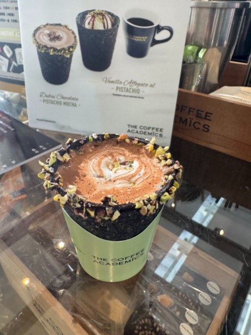 そしてここで飲んだのが上記のラテなんですが…これ、実はカップがチャコール色のハードコーンなんです。つまり、食べられるカップにドバイピスタチオチョコがまぶされ、その中にラテがあるという構造。日本ではあまり見かけない飲み物なんですが、アジアではちょこちょこ見ますね、これ。