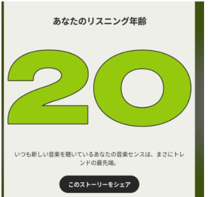 ちなみに今年追加された秀逸な施策がこの「リスニング年齢」。年齢というのは世界共通、世代共通の最強クラスのフォーマットですよね。自分が上でも下でも、別にリスニングに関する年齢なので楽しみながらシェアできる。実際私の観測範囲ではこのリスニング年齢のシェアが一番多かったように思います。